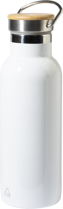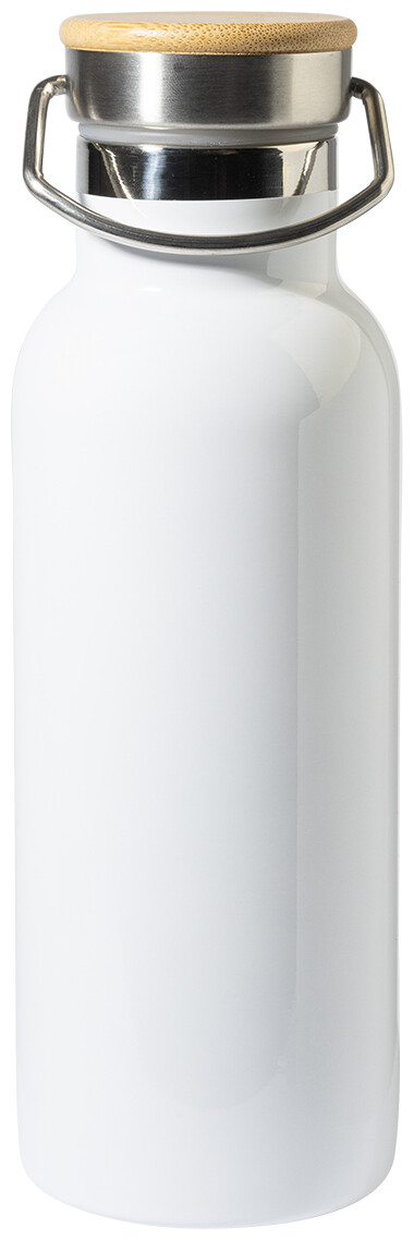 Dvoustěnná, vakuově izolovaná láhev z recyklované nerezové oceli pro sublimační tisk s bambusovým víčkem. 500 ml.