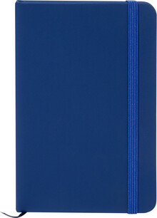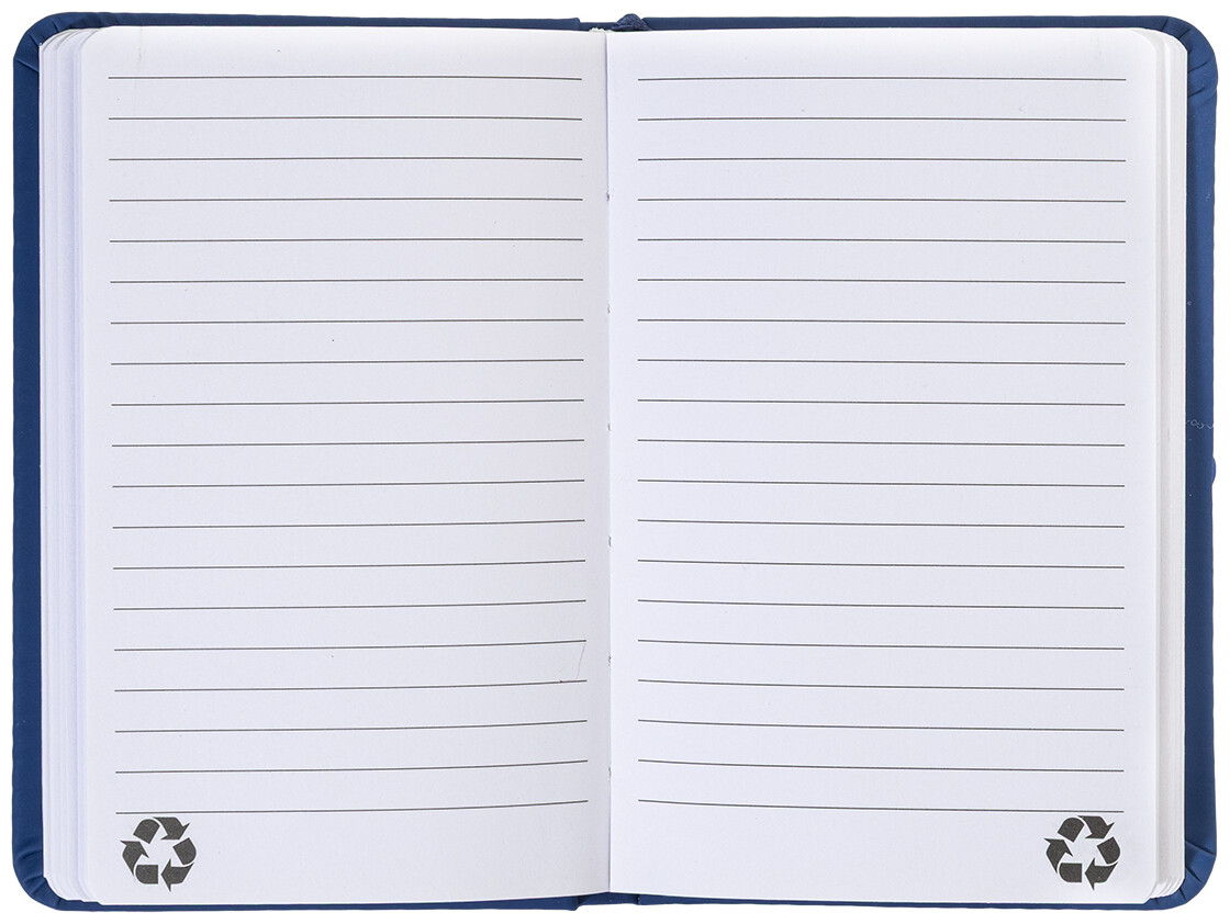 Blok potažený recyklovanou PU kůží se 100 linkovanými listy z recyklovaného papíru. Se záložkou v odpovídající barvě a gumičkou. Velikost A6.