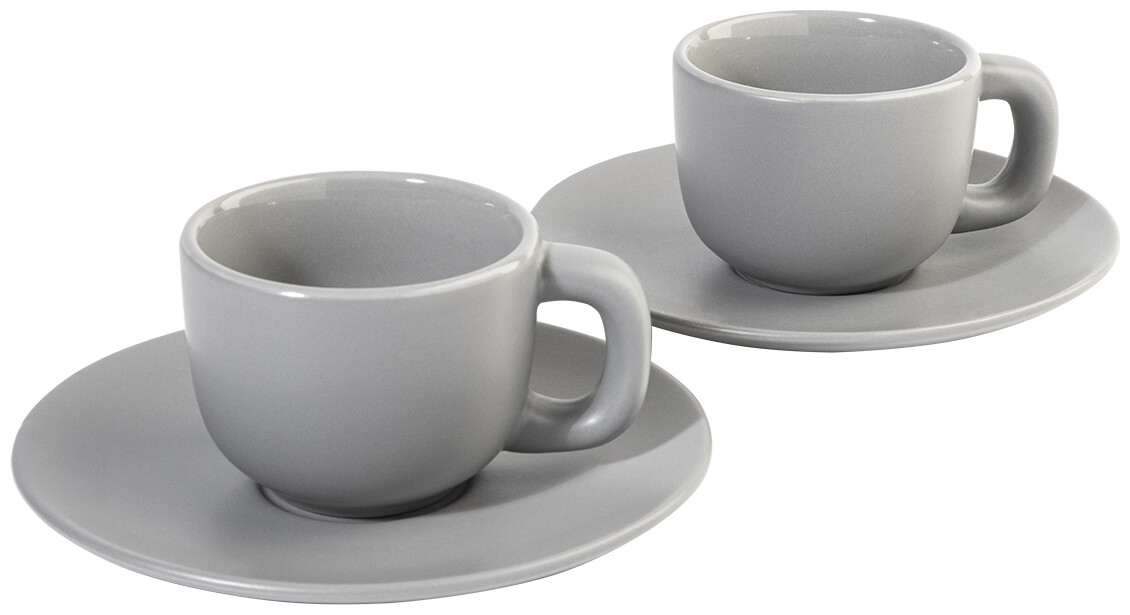 Vysoce kvalitní sada keramických šálků na espresso se 2 šálky a podšálky. S matnou vnější a lesklou vnitřní povrchovou úpravou. 85 ml. V kraftové papírové krabici.
