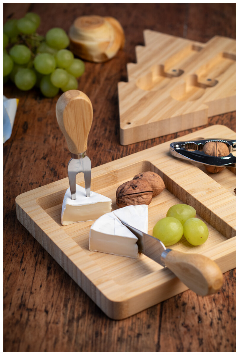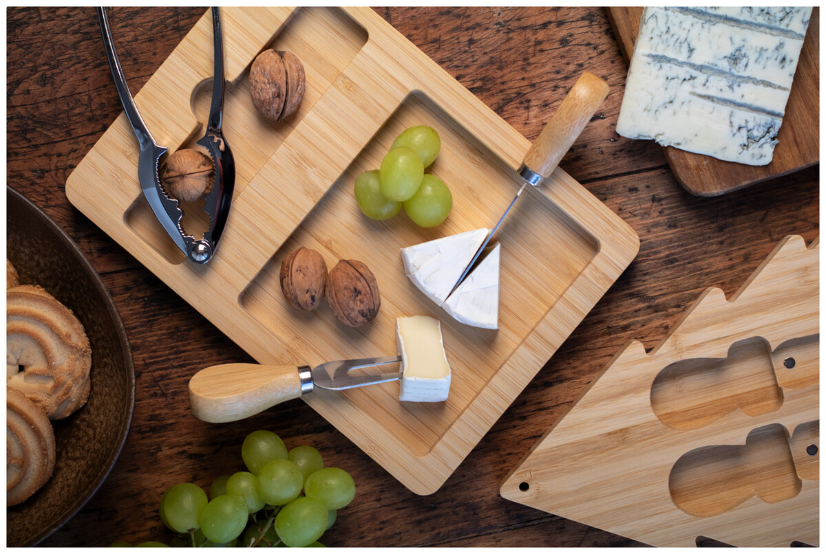 Sada na louskání ořechů s bambusovým tácem a kovovým louskáčkem. V kraftové papírové krabici.
