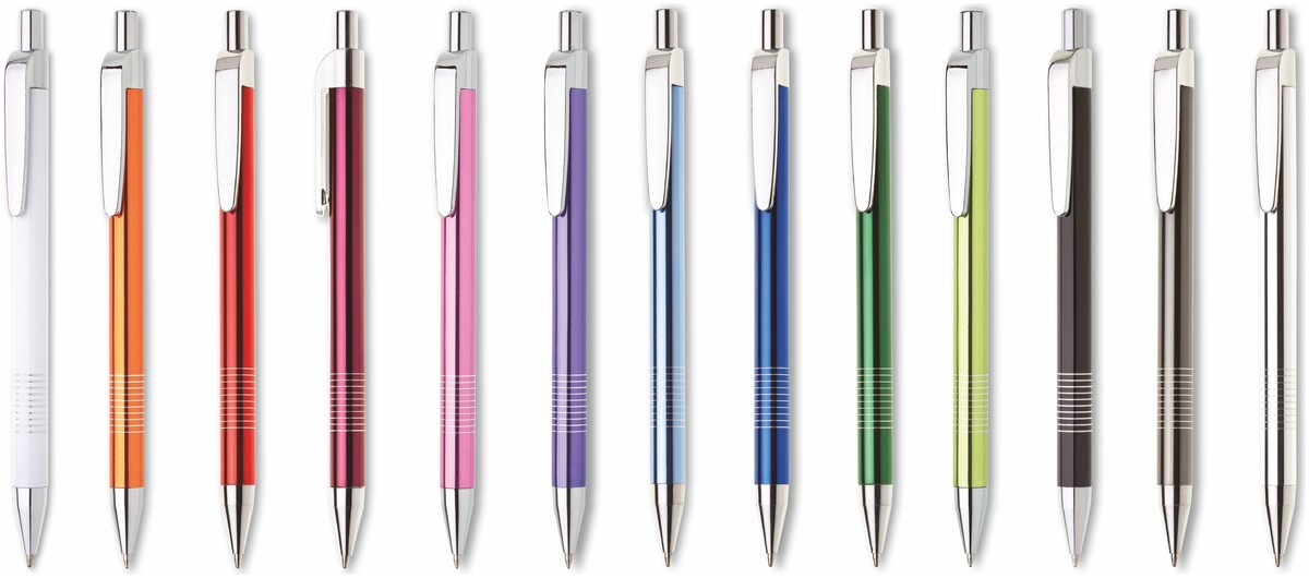 Kuličkové pero LAURIA je vyrobeno z hliníku. Má barevné tělo se stříbrnými doplňky jako jsou špička, klip a cvakátko. Úchopová část má 10 stříbrných proužků po celém obvodu tužky. Náplň- X20, modře píšící. Barevný MIX 25 ks v plastové krabičce.