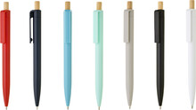 Stylové pero XELIO RABS s barevným plastovým tělem a elegantním bambusovým cvakátkem. Náplň X-20, modře píšící.