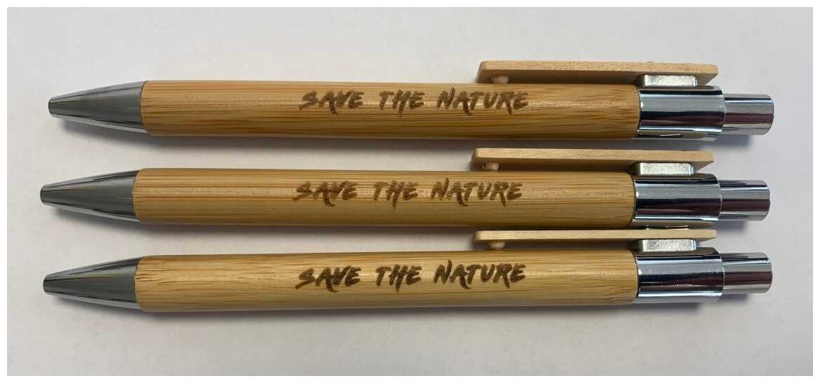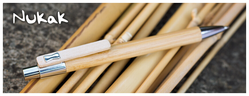 Bambusová propiska NUKAK s dřevěným klipem, chromovou špičkou a chromovým cvakátkem. Náplň velkoobsahová, modře píšící.