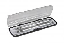 Dárková sada kuličkového pera a mechanické tužky 0,5 mm dodávaná v plastové krabičce, lesklé tělo z eloxovaného hliníku, plastová náplň A3 modrá. Barevné provedení: stříbrné.