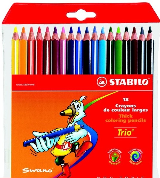 Trojhranné silné ergonomické pastelky, které se dobře drží v ruce. Šířka hrany 9 mm. Nelámavá tuha s vysokým obsahem kvalitních pigmentů, průměr tuhy 4,2 mm. K dostání v baleních 12 a 18 barev.