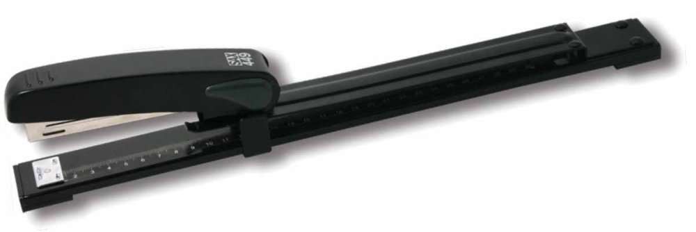 Sešívač s dlouhým ramenem. Sešívací výkon 20 listů papíru, hloubka vložení 300 mm, spony 24/6 a 26/6, Možnost pevného či volného sešití.