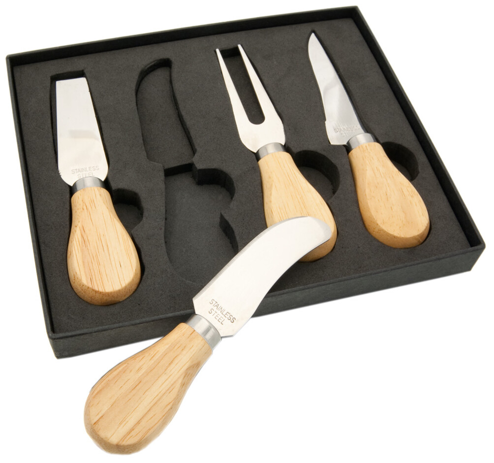 4 druhy nožů z nerezové oceli s dřevěnou rukojetí v černé dárkové krabičce.
