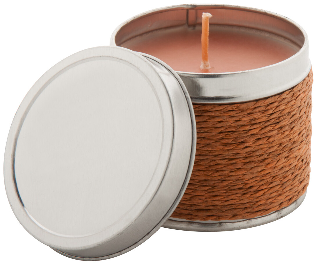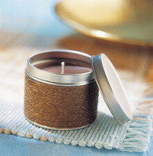 Vonná svíčka v kovové krabičce omotané provázkem.
