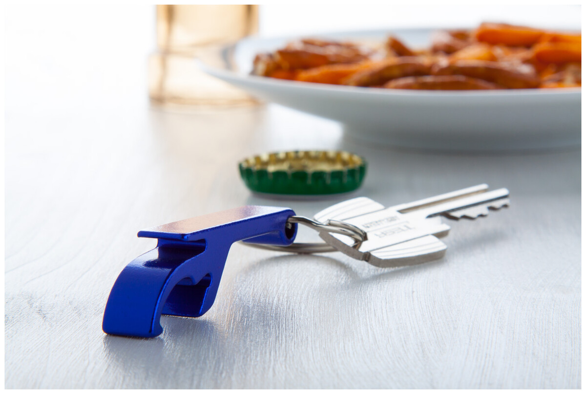 Hliníkový otvírák s kroužkem na klíče.
