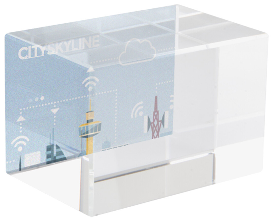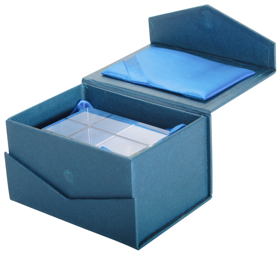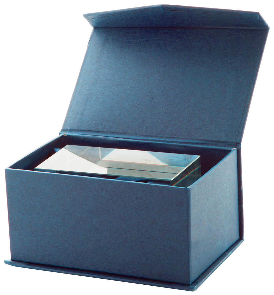 Skleněná krychle. V magnetické tmavě modré dárkové krabičce.
