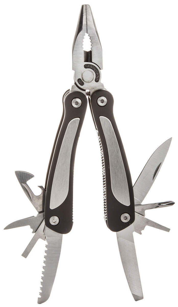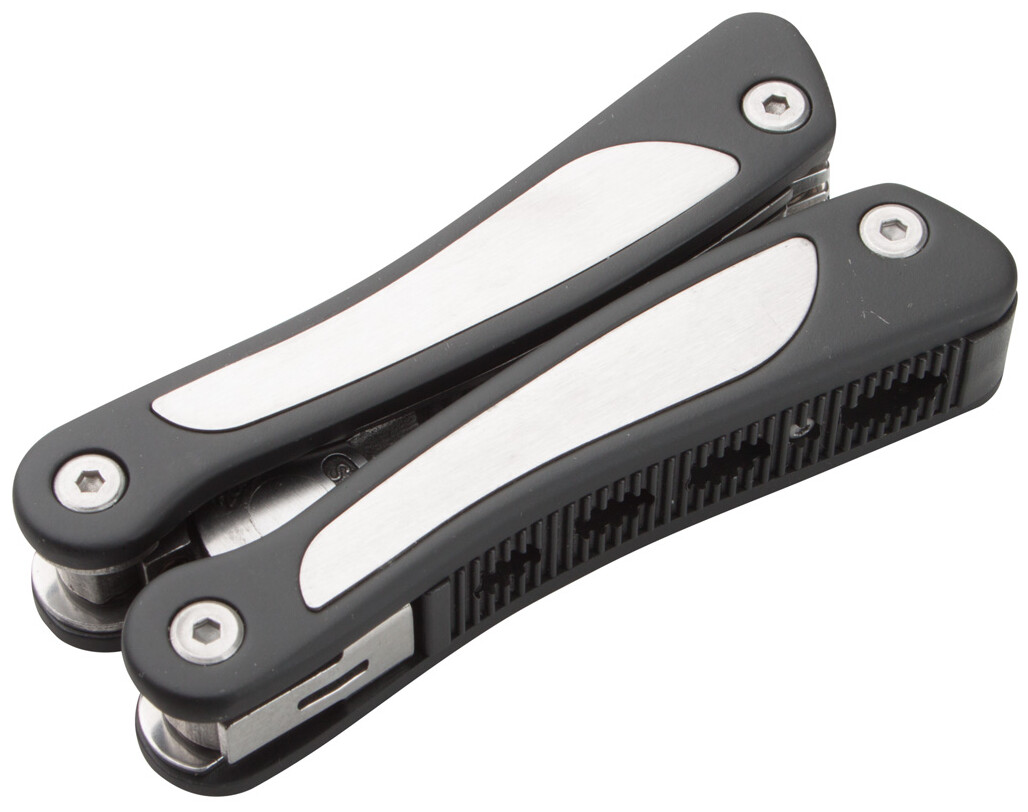 Multifunkční kleště z nerezové oceli s 9ti funkcemi: kleště, pilník, 3 šroubováky, 2 velikosti nožů, otvírák na plechovky a pilka. Dodáváno s polyesterovým pouzdrem.