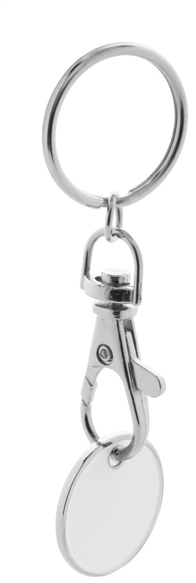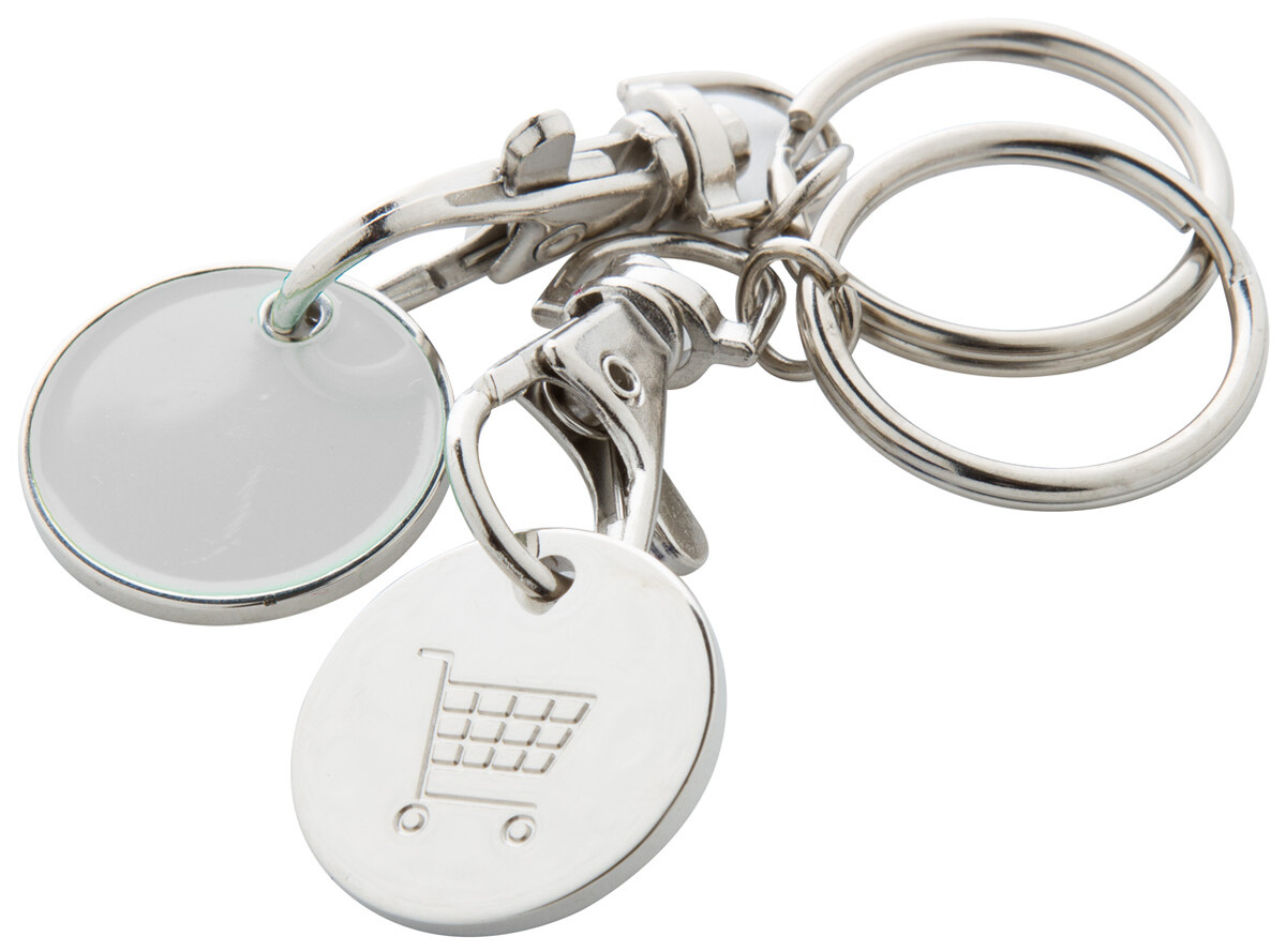 Kovový přívěšek na klíče se žetonem do nákupního košíku. Jedna strana mince je barevná, na druhé je vyražen nákupní vozík. Velikost: ø23×1,7 mm.