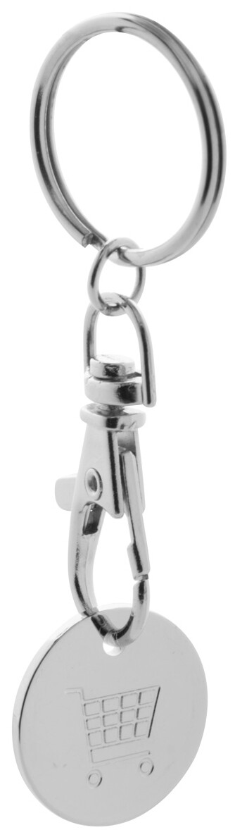 Kovový přívěšek na klíče se žetonem do nákupního košíku. Jedna strana mince je barevná, na druhé je vyražen nákupní vozík. Velikost: ø23×1,7 mm.