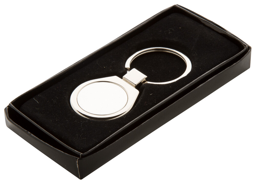 Kovový přívěšek na klíče v krabičce z černého kartonu.
