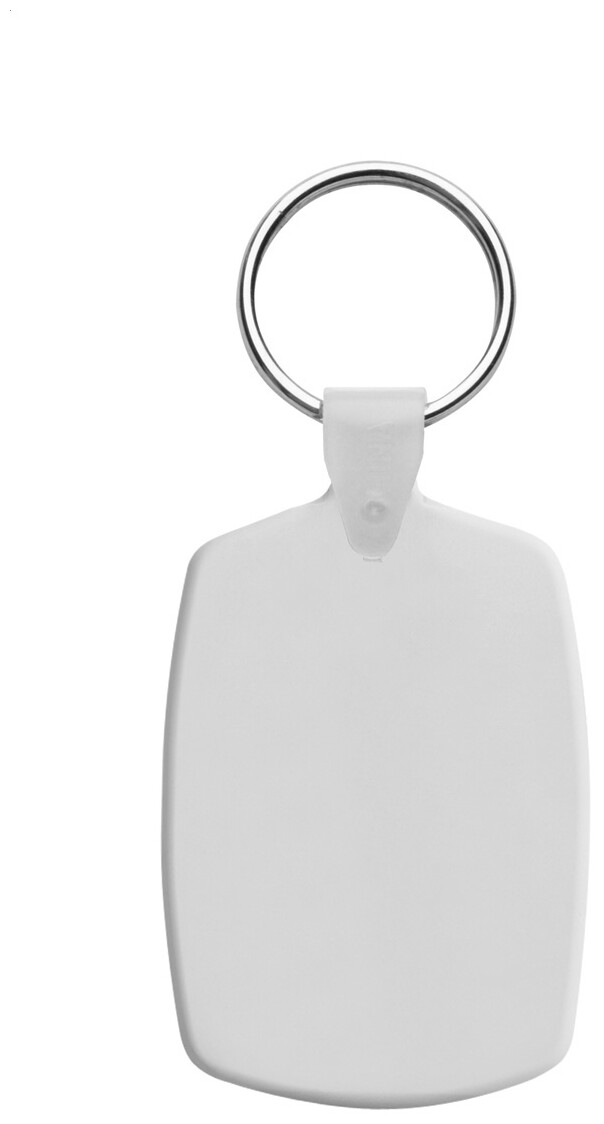 Plastový obdélníkový přívěšek na klíče s kovovým kroužkem.