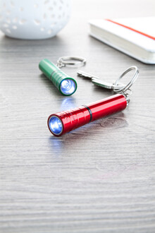 Plastová mini baterka s 1 LED, kovovým povrchem a kovovým kroužkem na klíče. S knoflíkovou baterií.