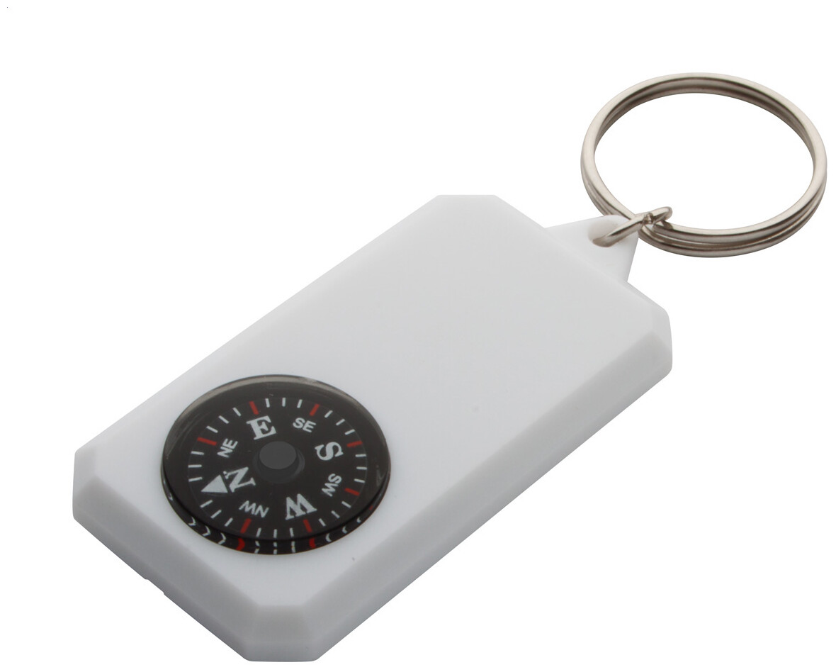 Plastová klíčenka s kompasem a kovovým kroužkem.