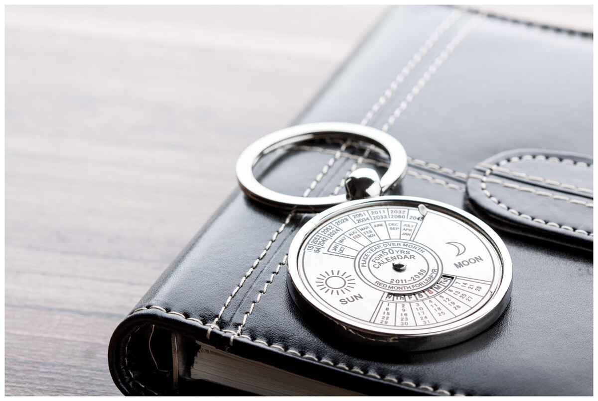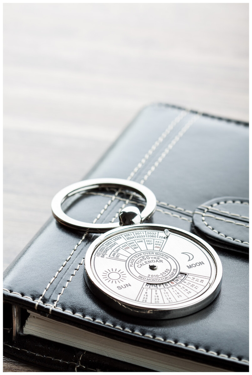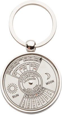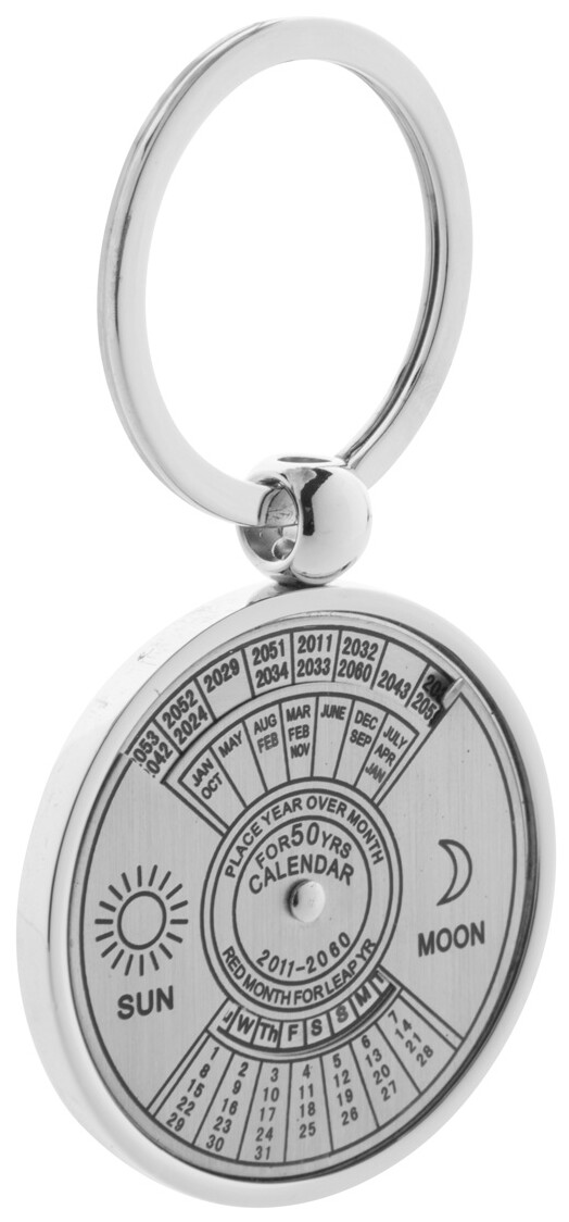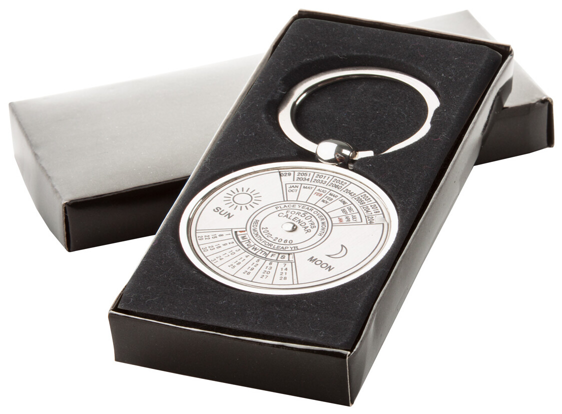 Kovový přívěšek na klíče s otočným kalendářem až do roku 2060, v černé dárkové krabičce.