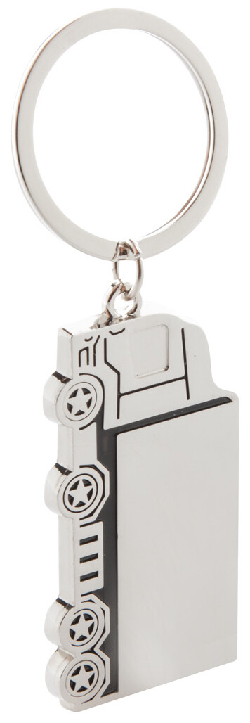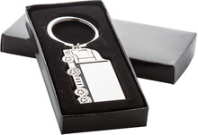 Kovový přívěšek na klíče ve tvaru kamionu v černé kartonové krabičce.