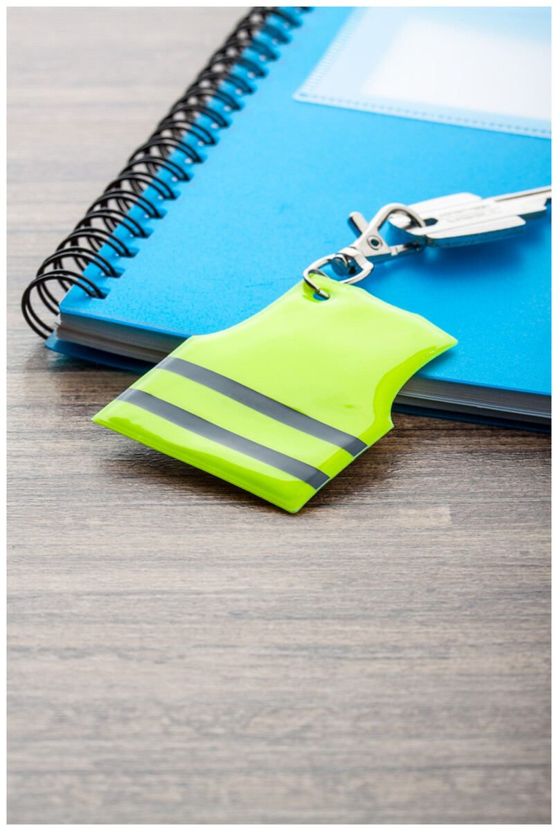 Přívěšek na klíče ve tvaru reflexní vesty, s karabinou. Pouze pro propagační účely, se produkt nekvalifikuje jako osobní ochranný prostředek.