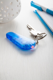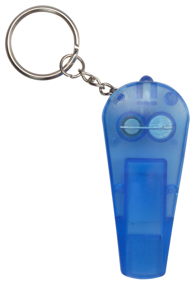 Transparentní plastová píšťalka s kroužkem na klíče se svítilnou, vč. baterií.
