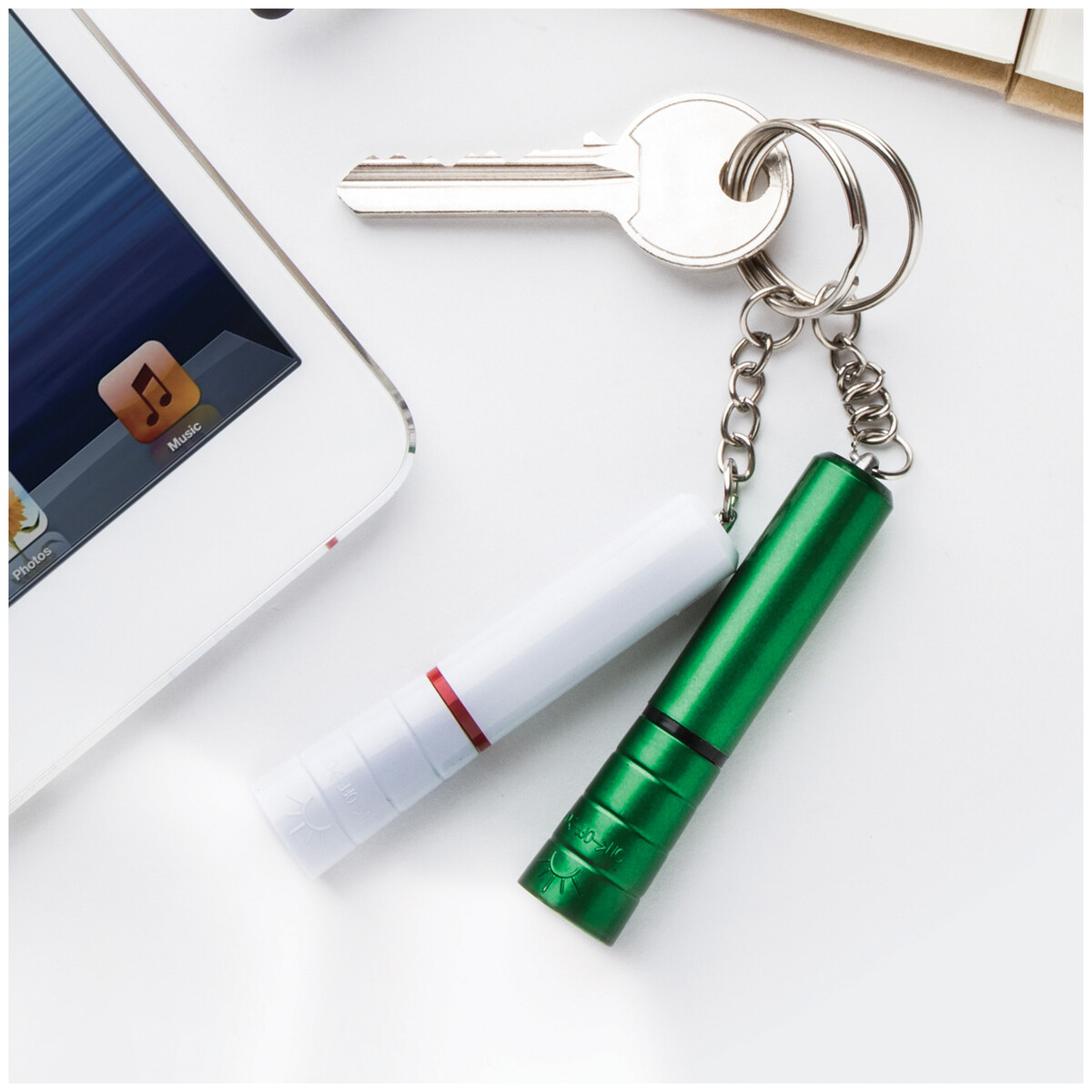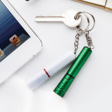 Plastová mini baterka s 1 LED a kovovým kroužkem na klíče. S knoflíkovou baterií.
