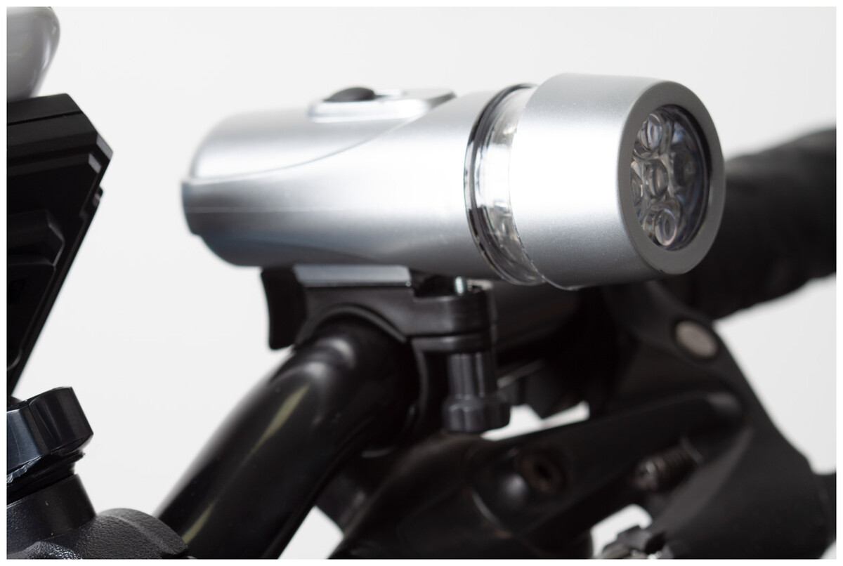 Plastová sada světel na kolo s připevněním na řídítka a sedlo. Přední světlo s 5ti LED diodami, zadní blikačka s 5ti LED diodami. Pracuje s 6ti AAA bateriemi. Dodáváno bez baterií. Neprodejné v následujících zemích: Německo, Rakousko, Švýcarsko.