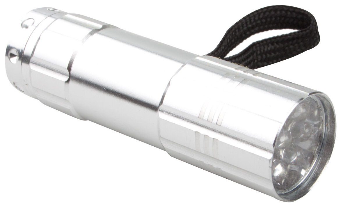 Hliníková baterka s 9ti LED diodami s páskem kolem ruky. Včetně 3 AAA baterií.