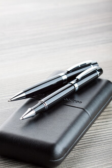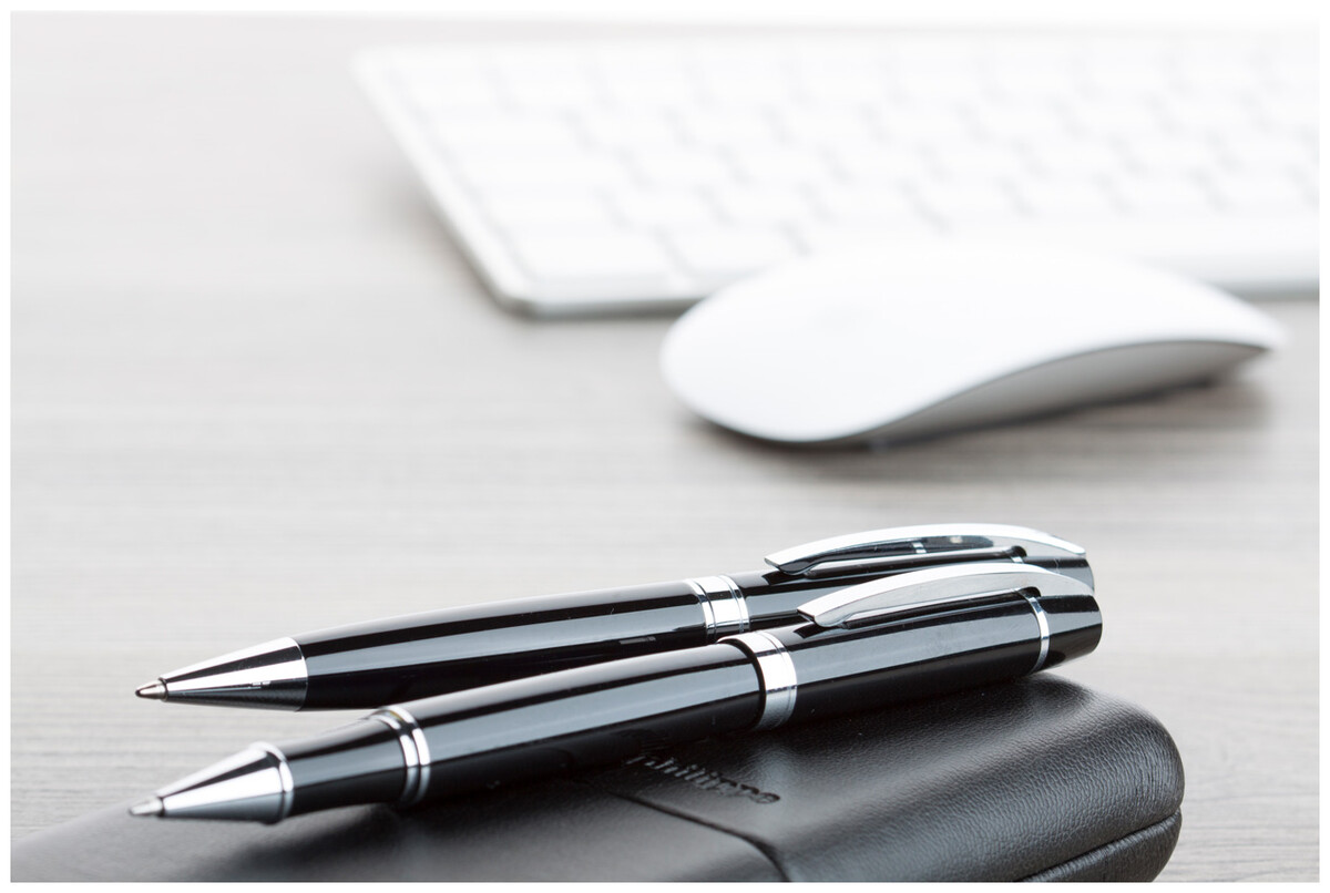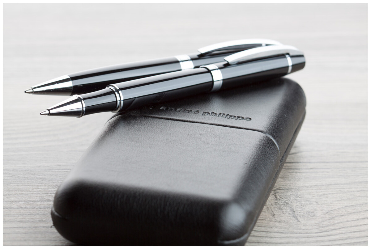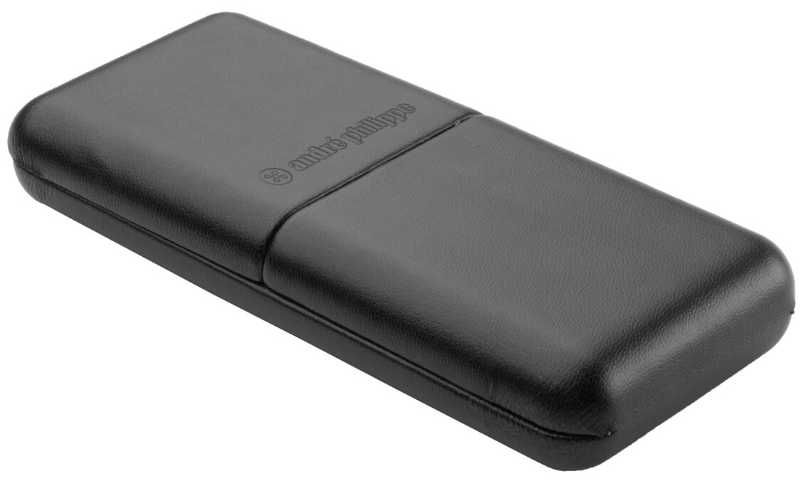 Sada per - elegantní kovové kuličkové pero a roller s lesklým chromovaným zdobením značky André Philippe. V dárkové krabičce z PU kůže a s modrou náplní.