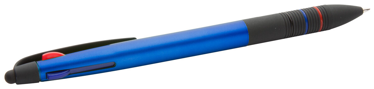 Plastové kuličkové a dotykové pero s pogumovaným úchopem a tělem s matnou metalickou úpravou. Tři barevné náplně: modrá, černá a červená.