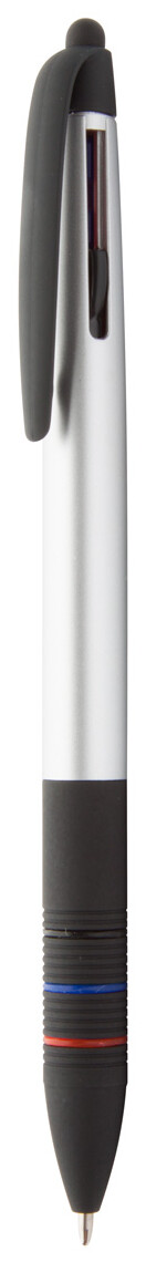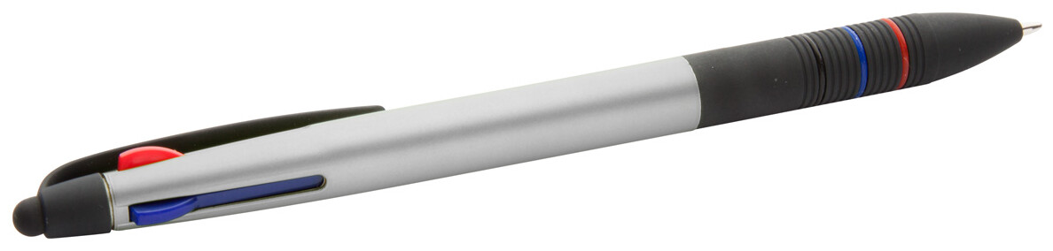 Plastové kuličkové a dotykové pero s pogumovaným úchopem a tělem s matnou metalickou úpravou. Tři barevné náplně: modrá, černá a červená.