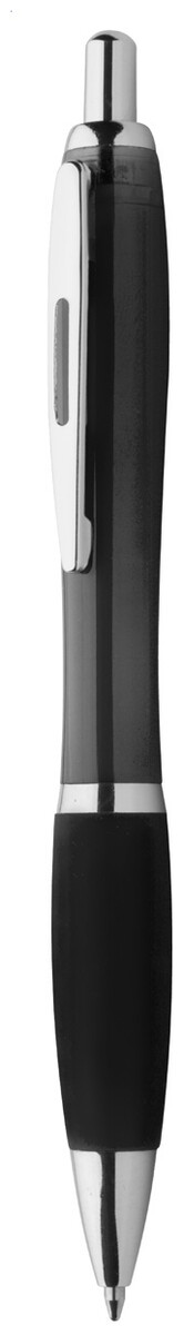 Plastové kuličkové pero s průhledným tělem, úchopem v odpovídající barvě a lesklými chromovanými částmi. S modrou náplní.