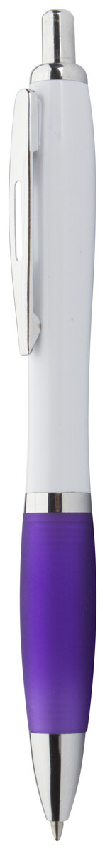 Plastové kuličkové pero s bílým tělem, barevným úchopem a lesklými chromovanými částmi. S modrou náplní.