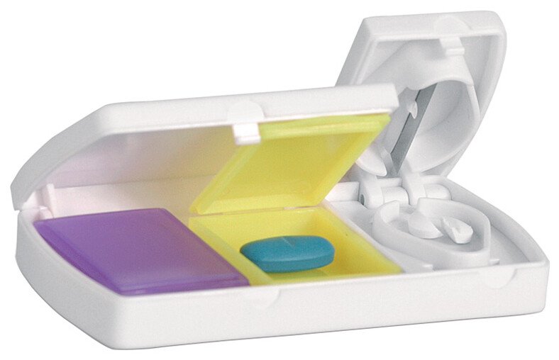 Plastový box na pilulky se dvěmi přihrádkami a řezátkem na léky.