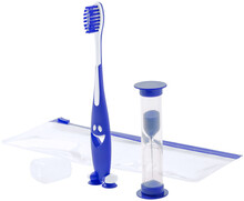 Sada na čištění zubů pro děti s plastovým kartáčkem a přesýpacími hodinami, v obalu na zip.