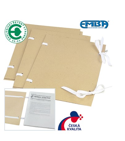 formát A4 • barva hnědá s bílými tkanicemi • rozměry 315 x 230 mm • provedení z hladké lepenky 1,2 mm • kompatibilní s archivační krabicí č.1 • opatřeno ražbou pro snadný popis • ekologicky šetrný výrobek • 25 ks v balení