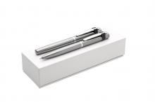 Elegantní dárková sada s propiskou a rollerem v bílé krabičce se značkou GABRIELIS. Tužky mají otočný mechanismus, roller odnímatelné víčko. Povrch tužek leskle šedý se stříbrným klipem v černém úchytu.