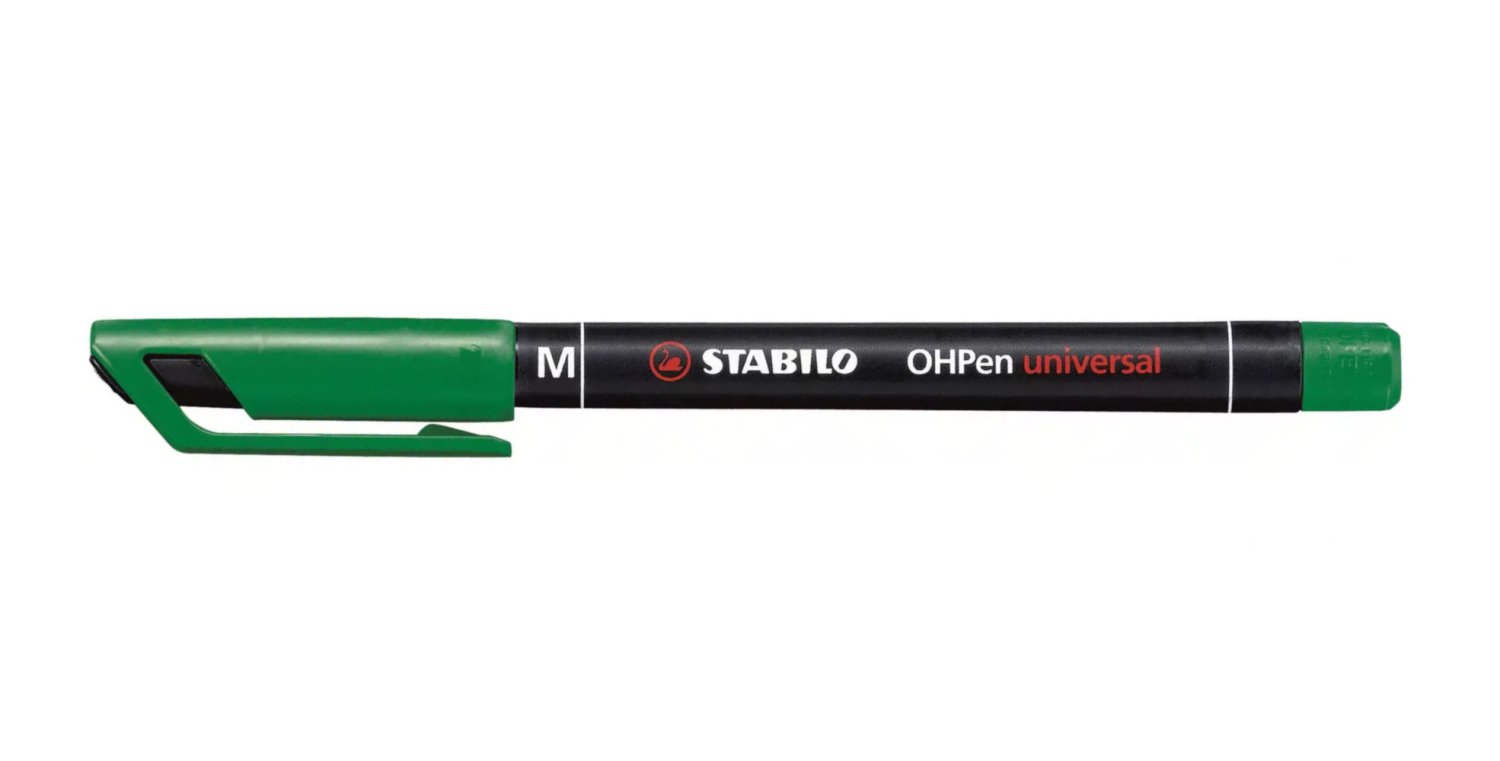Potřebujete dát svoje myšlenky na papír nebo je prezentovat ostatním? STABILO OHPen Medium popisovač píše téměř na všechny hladké povrchy. Černé tělo popisovače značí permanentní inkoust zelené barvy. Stopa šíře 1 mm. Neklouzavá zóna zaručuje pohodlný úchop a díky praktickému klipu se nebude nikam kutálet. Ochrana proti vysychání, vydrží až 72 hodin bez víčka. Na konec pera lze připevnit víčko.