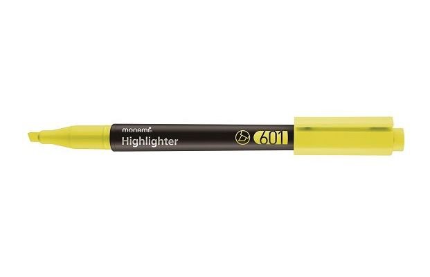 Monami 601 jsou zvýrazňovače, které se pohodlně drží, kulaté plastové tělo je příjemné na dotek. Stopa je stálobarevná od začátku do konce, nedochází k blednutí inkoustu na papíře. Ideální na zvýrazňování, malování, vybarvování. Rovnoměrná žlutá stopa inkoustu se udrží na kopiích, klasickém ale i faxovém papíře. Seříznutý hrot 5 x 1 mm. Víčko v barvě náplně s klipem k uchycení, zabraňuje kutálení z polic nebo jiných nerovných míst.