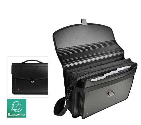 Víceúčelová aktovka 38 x 26 cm. Obsahuje několik oddílů a přihrádek pro efektivní uložení dokumentů a drobností. Velikost vhodná pro uložení notebooku až do velikosti 15‘. Možno připnout ramenní popruh pro snadnější transport. Vyrobeno z extra silného (2 mm) a odlehčeného polypropylenu.