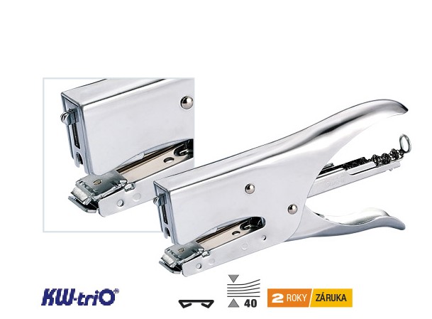Robustní celokovové pochromované sešívací kleště pro sešívání v jakémkoliv úhlu s ergonomickým gripem snižujícím únavu ruky. Snadné plnění a výměna drátků. Zpřevodování usnadňuje sešívání v ruce. Kapacita zásobníku je 100 drátků velikosti 24/6 - 8. Kapacita (listů 80 g/m2) 40; max. Hloubka vložení 5,5 cm. Záruka 2 roky.