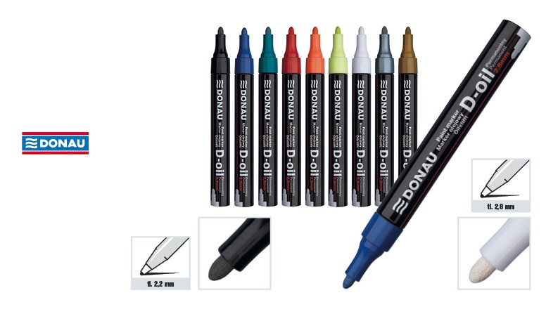 Lakový popisovač DONAU D-oil - voděodolný, rychleschnoucí a permanentní inkoust vhodný pro téměř všechny povrchy. Ekologicky šetrný, neobsahuje xylen. Kulatý hrot: 2,2 mm, nebo 2,8 mm. Samostatně balen do ochranné fólie. Detailní specifikace u jednotlivých popisovačů.
