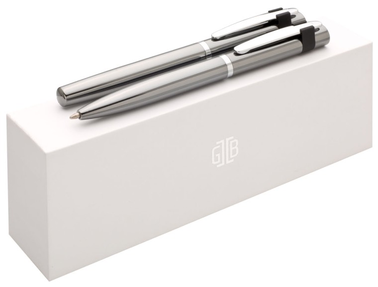 Elegantní dárková sada s propiskou a rollerem v bílé krabičce se značkou GABRIELIS. Tužky mají otočný mechanismus, roller odnímatelné víčko. Povrch tužek leskle šedý se stříbrným klipem v černém úchytu.