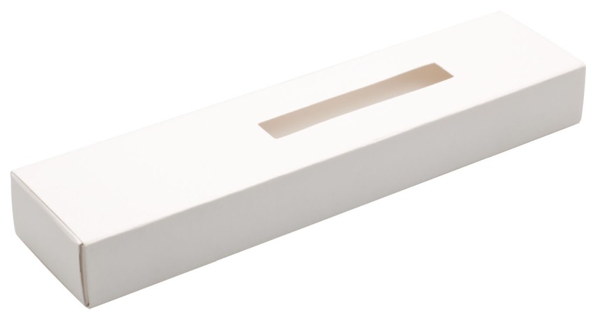 Krabička z bílého perleťového papíru na 1 tužku. V horní části výsek.