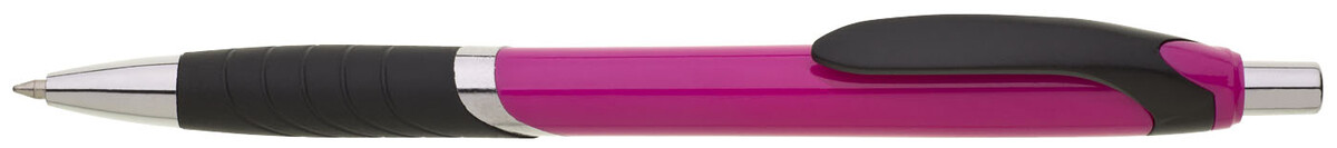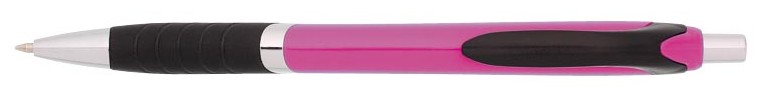 Plastové propisovací pero PEINA růžové. Pero má černý pogumovaný úchop s vroubky, zakončený stříbrným šikmým poružkem.Klip je včerné barvě. Náplň je X20 , píše modře.