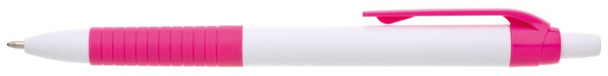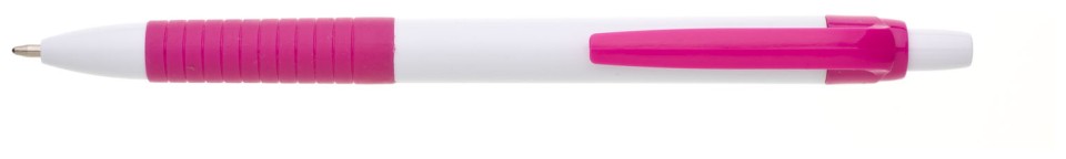 Propiska s bílým tělem, tmavě růžovým gripem a klipem, náplň modře píšící.