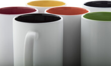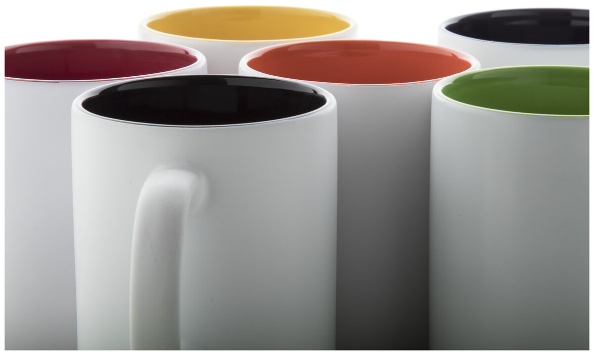 Witte keramiek mok met gekleurde binnenkant, de gegraveerd kleur is hetzelfde als de kleur van de binnenkant. In geschenkverpakking. Inhoud: 350 ml.