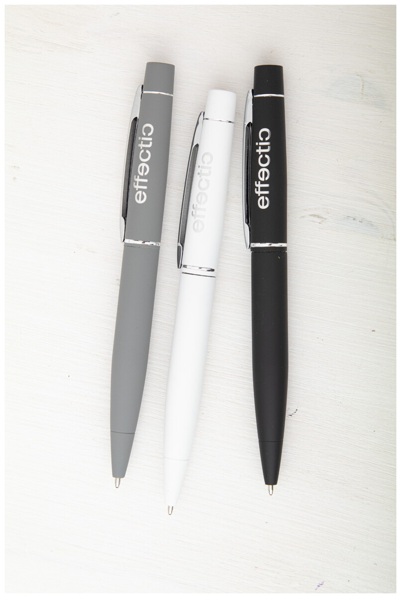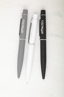 Kovové twist kuličkové pero s pogumovaným povrchem a modrou náplní. Speciální povrch pro laser stříbrného loga.