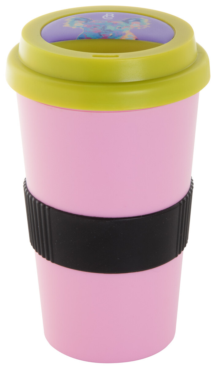 Dvoustěnný plastový termo hrnek s víčkem na pití a silikonovým úchopem na zakázku. 400 ml. Min. mn.: 50 ks.