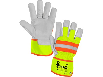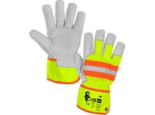 Kombinované rukavice, žluto-oranžové s reflexním doplňkem. Kovové očko v manžetě pro zachycení na karabinu.